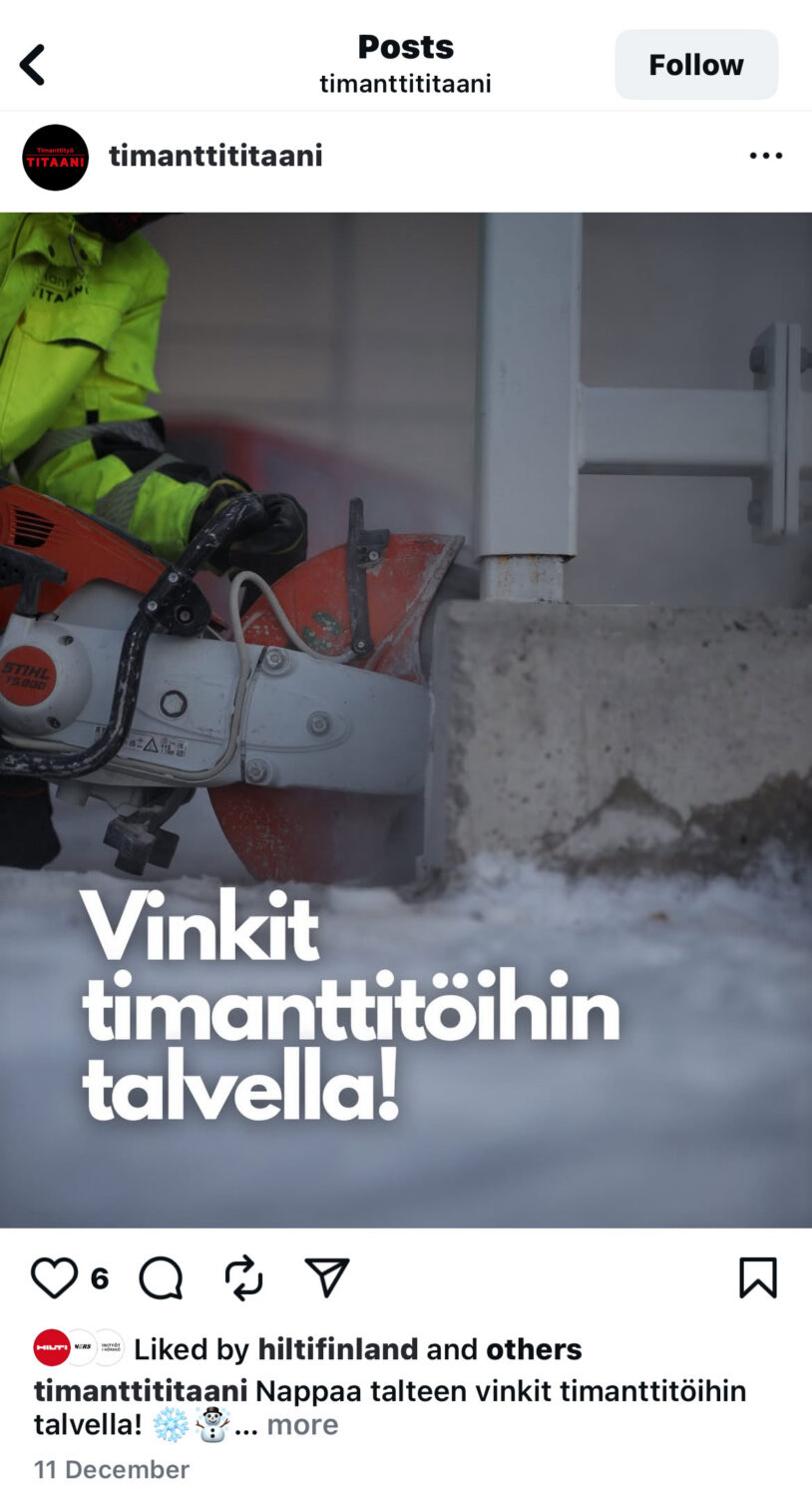 Miten teet sen? Tykkäät heistä kaikkialla, kuten Instagramissa, osoittaaksesi kaikille tukeville seuraajillesi, että Hilti tukee heitä. Tämän todistaa myös se, että tykkäyksiä annetaan paitsi Hiltin tuotteille, myös kilpailijoiden työkaluille. Näiden yritysten tukeminen on sinulle tärkeämpää kuin reilu kilpailu, markkinoiden puhtaus ja oikeudenmukainen asenne kaikkeen.