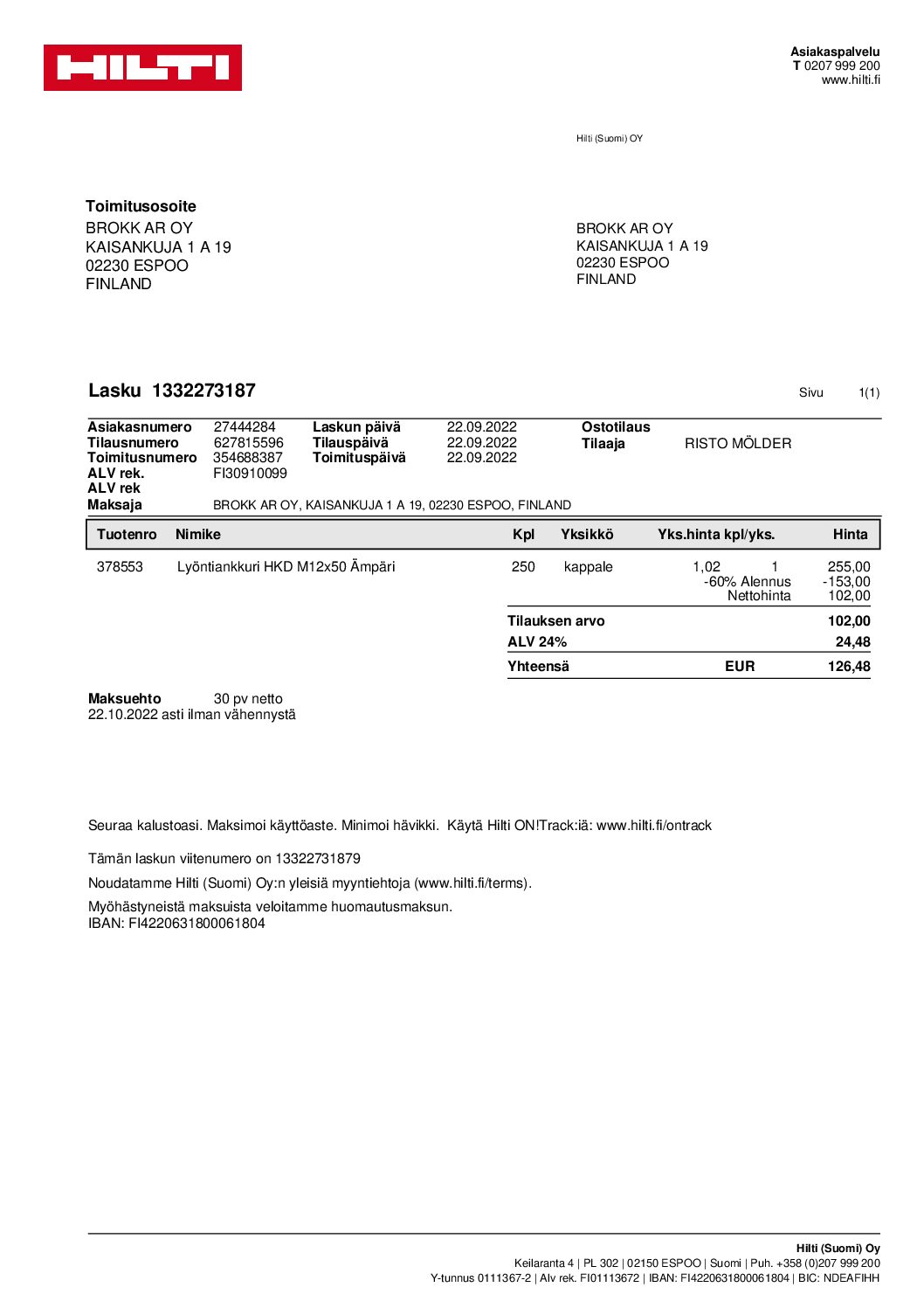 /Hiltin kanssa sovittiin hinnoista, että ne olisi samat Tim-Antilla kuin ne oli Brokk AR:lla. Selvisi kuitenkin, että hinnat oli noussu reilusti esim. eräskin tuote yli 150%. Tämmöisellä toiminnalla tuette heitä ja vaiennatte meidät ja rasitatte meitä kustannuksilla, jotta voitte yhdessä pakottaa meidät pois markkinoilta? Valitettavasti ette, se ei toimi niin. Vahingoitatte vain itseänne. Toivomme vilpittömästi, että Hiltillä on selkärankaa pyytää meiltä anteeksi ja näyttää itsestään erilaisen puolen uutena vuotena ja toimia esimerkkinä kaikille muille jälleenmyyjille./